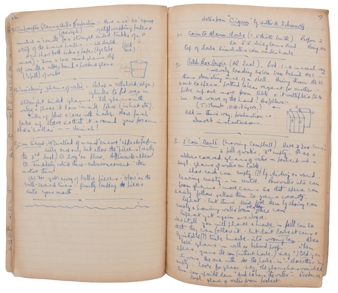 Magician’s scrapbook filled with handwritten routines of various tricks, along with clippings from books and magazines, and instruction sheets. Extensive and detailed instructions for popular effects are included, which occasionally feature crude drawings. Ex-libris Dion Matthews (who we believe to be the writer and compiler of the book), gifted to Eddie Dawes by Bryan Houghton, with a gift notation pasted down, and signed by Houghton. Over 100 pages, and including a handwritten index of the contents on the first leaf. Hinges loose, chips to spine, fair to poor condition, but a unique document of mid-century British magic effects.