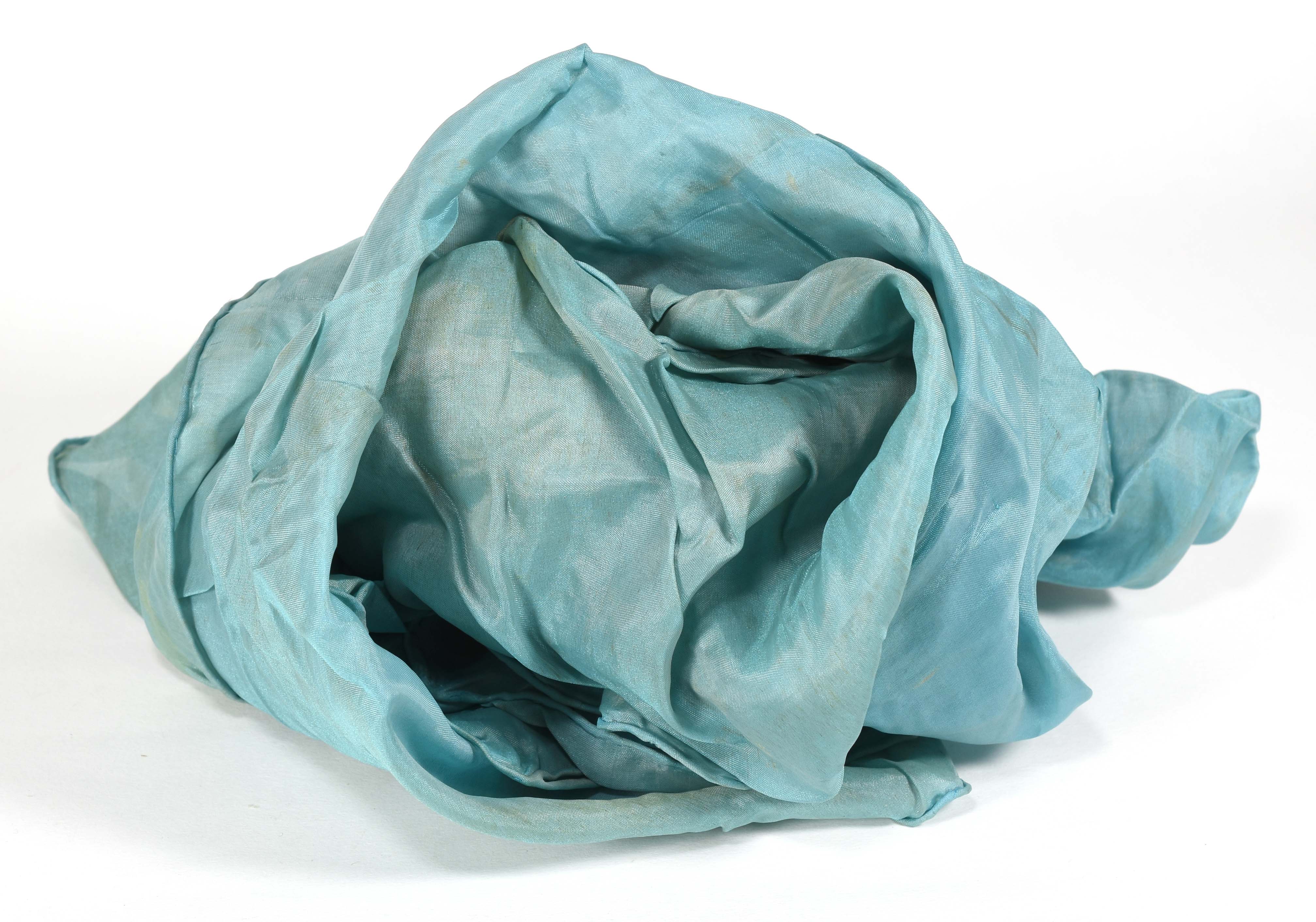 Solid, baby blue colored silk . Small tag in corner indicates this was made with silk imported from Japan. A few spots, edges toned. Good condition.