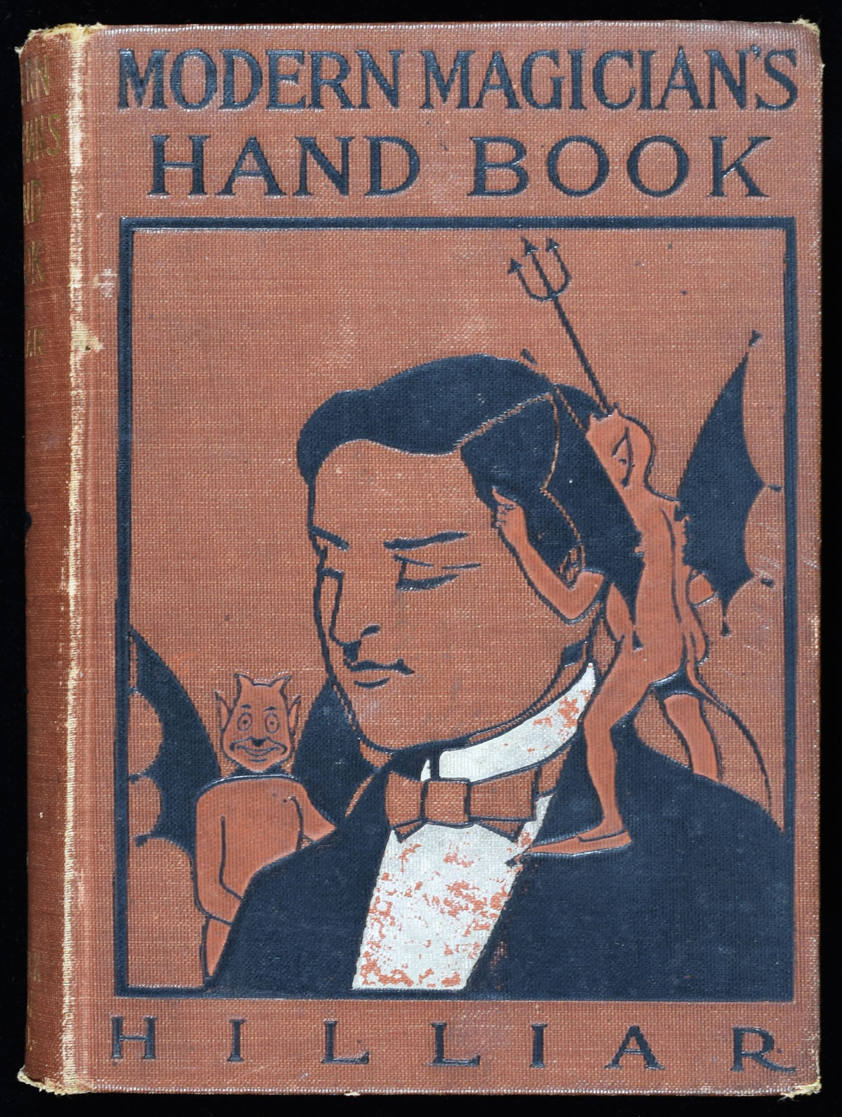 "An up-to-date treatise on the art of conjuring." Pictorial publisher's red cloth hard cover, stamped with red, black, gilt, and white. Portrait frontispiece, illustrated, 440 pages. Binding generally worn and toned with front hing nearly detached internally from spine. Pages generally clean.