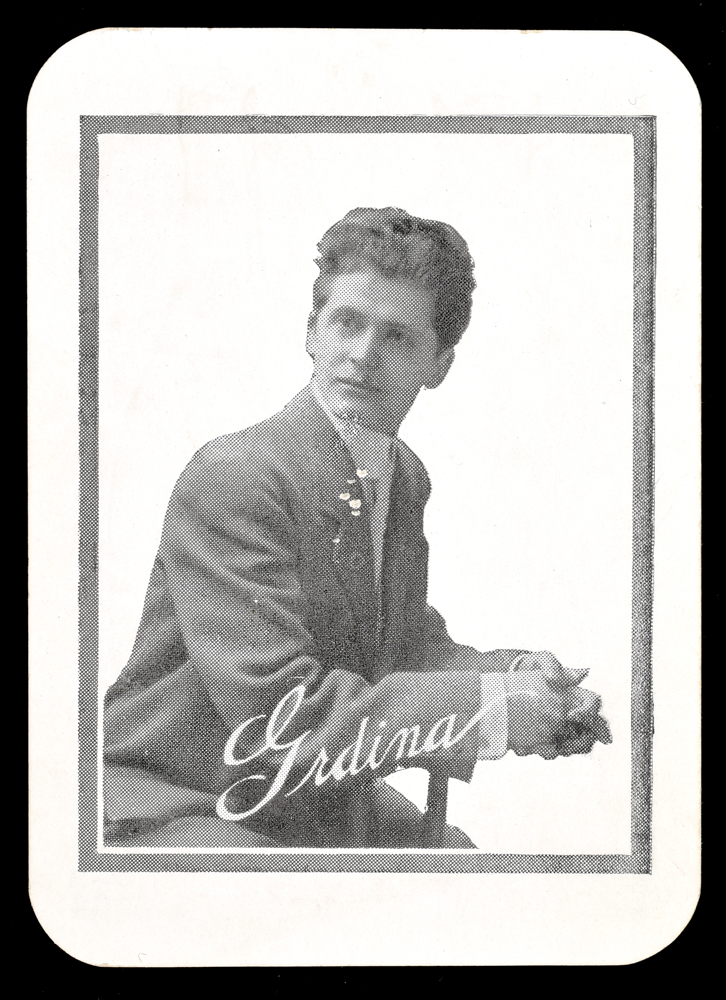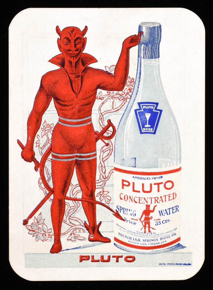 Throw-out card for the magician Grdina, with a Pluto Concentrated Spring Water advert on the reverse featuring a devil. A few small scrapes, else very good condition.