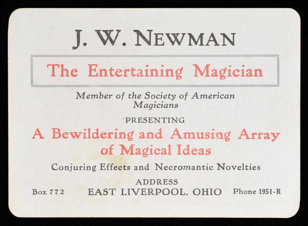 "A Bewildering and Amusing Array of Magical Ideas, Conjuring Effects and Necromantic Novelties." With Newman's permanent address and phone number, this card has a common stock back design. A few spots on front, scraped back from scrapbook removal.