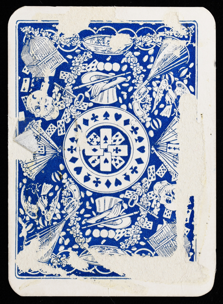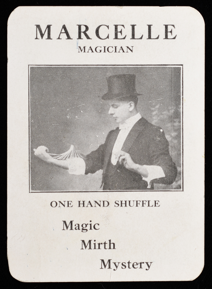 Featuring an image of Marcelle doing a one-handed shuffle. "Magic, Mirth, Mystery." Back design printed off-center, scraped from scrapbook removal. A few marks on front. Good condition.