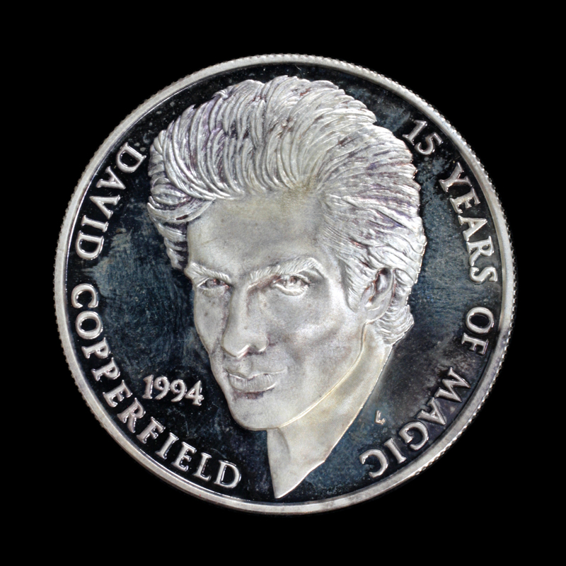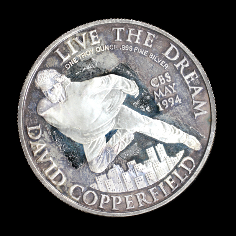 With a sculpted bust portrait of the magician and "David Copperfield, 15 Years of Magic, 1994" on one side, and a depcition of Copperfield flying with "David Copperfield, Live the Dream, One Troy Ounce .999 Fine Silver, CBS May 1994" on reverse. Some tarnish, a bit of adhesive residue. Good condition. MT077.102.