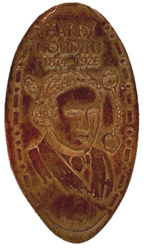 "HARRY / HOUDINI / 1874-1926 / (bust right of Houdini) / TMC-2" on one side. Elongated coin on reverse. Mild wear, else in good condition. MT166.000