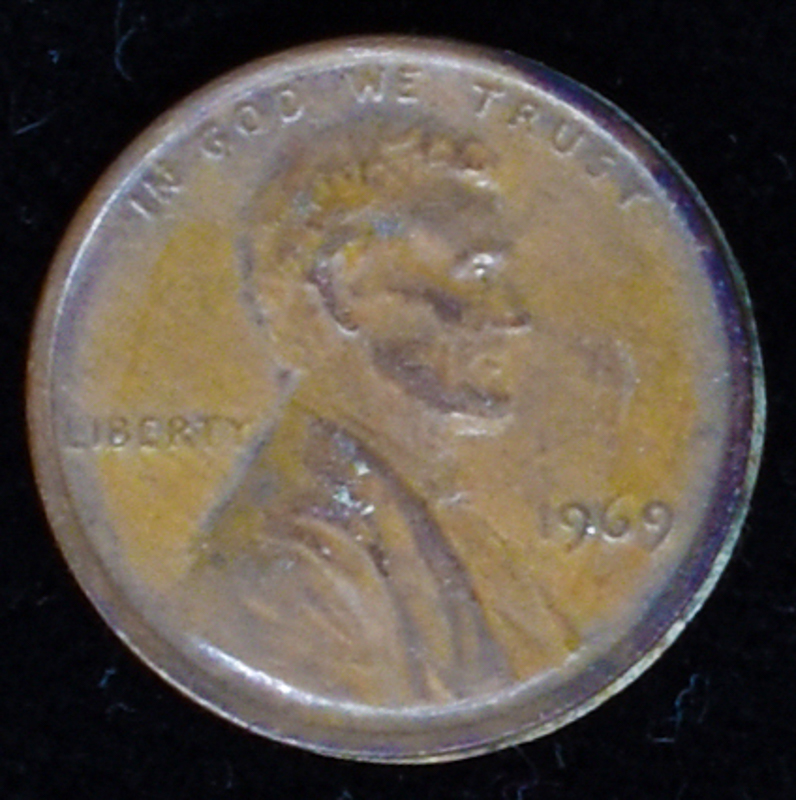 "MOLLO / MAGIC / 324 - 3494", blue ink paper sticker on one side. "US Cent, head, 1969" on reverse. Good condition. MT252.100