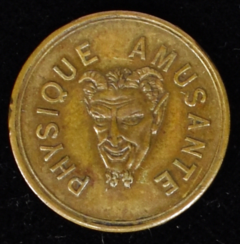 Devil's head, around is "PHYSIQUE AMUSANTE" on one side. One large star, five small stars within wreath on reverse. Possibly a variation of MT343.000?