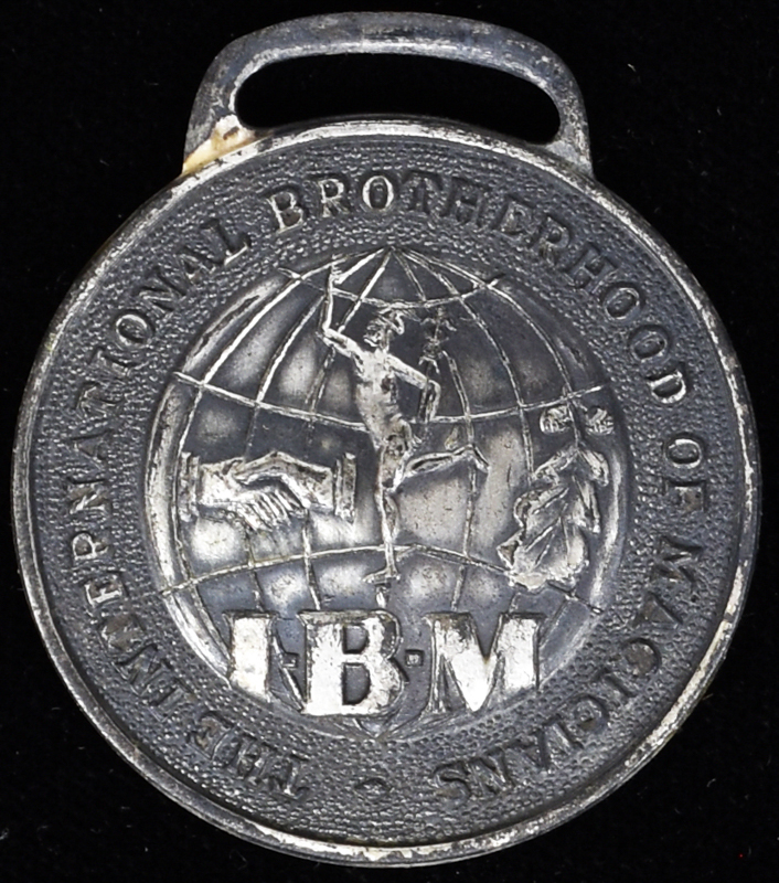 World, two hands shaking, oak leaf, "I.B.M.", around is "THE INTERNATIONAL BROTHERHOOD OF MAGICIANS" on one side. "ST. LOUIS / BUTTON CO" on reverse. Condition may vary slightly, good condition. MT168.000