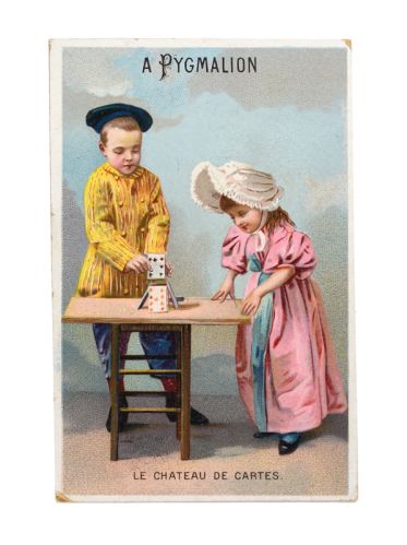 A Castle of Cards image on this trade card for the French company Pygmalion and their department store in Paris. Beautiful bright colors. Mildly worn corners, else very good.