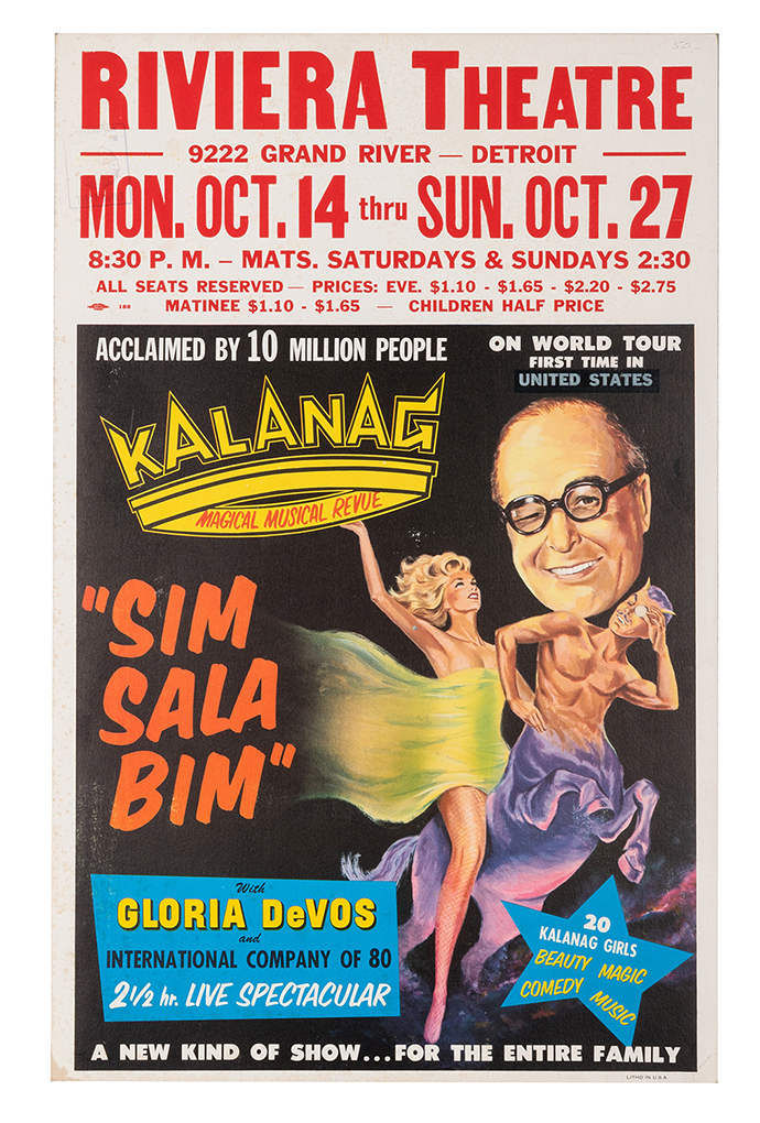 Full color window card for Kalanag with Gloria DeVos at Riviera theatre in Detroit, advertising the two-week run that ended disastrously for the German-born magician. Mild wear.