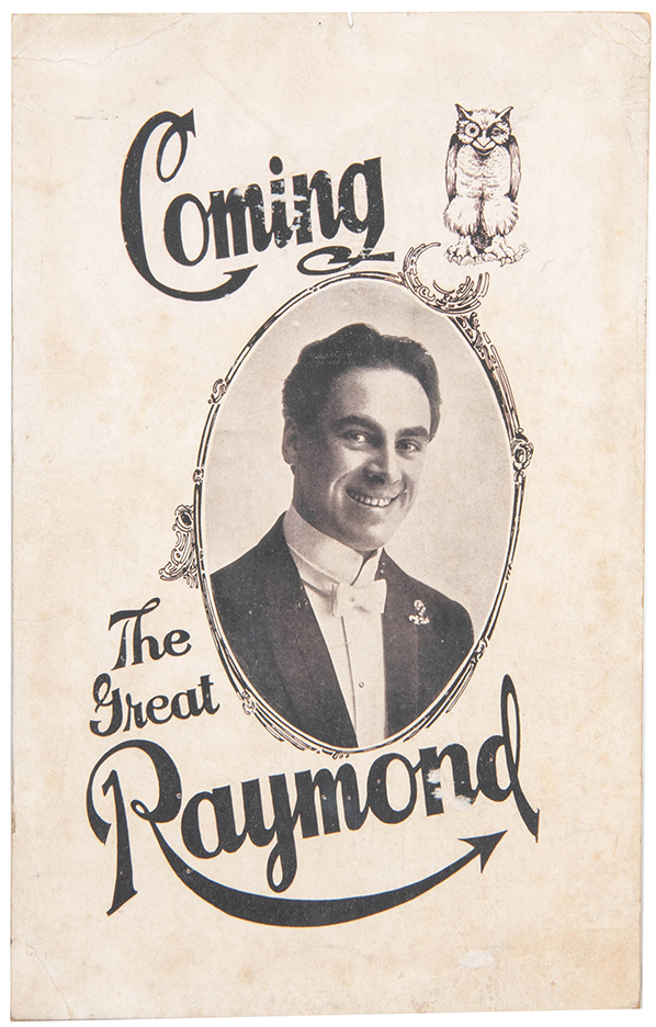 A small window card for the Great Raymond. Small chip and wear, glue residue to the back. B-.