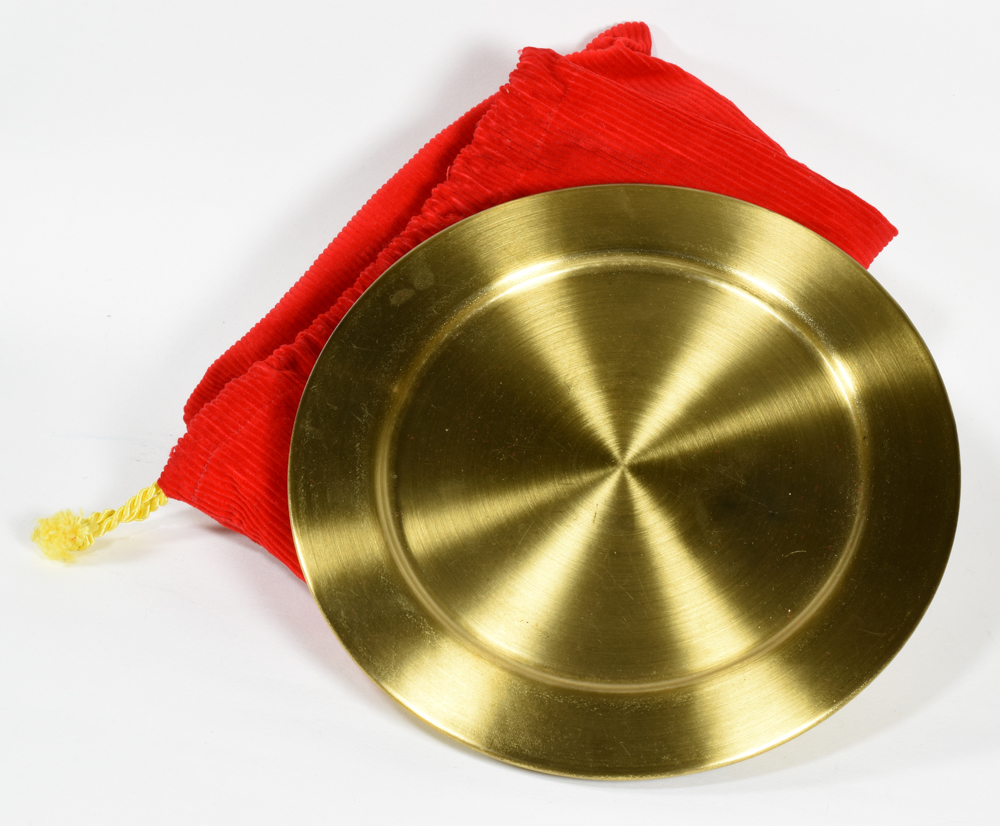 A magician and her two assistants take 10 cards out of a drawstring bag and place them on a calling card tray. During the routine, the last three cards are shown to the audience, covered by an assistant and magically appear in the drawstring bag. Includes bag, calling card tray and instructions. Minor soiling on tray, some threading on bag. Very good.